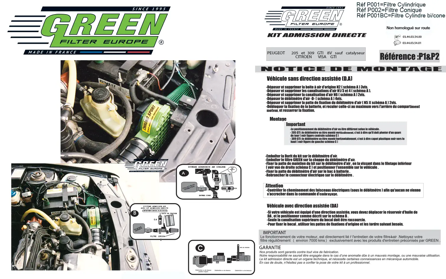 Direct air intake kit for PEUGEOT 205 1,6L GTI (Filtre Conique) (115 cv) years 84>89 ref. P002